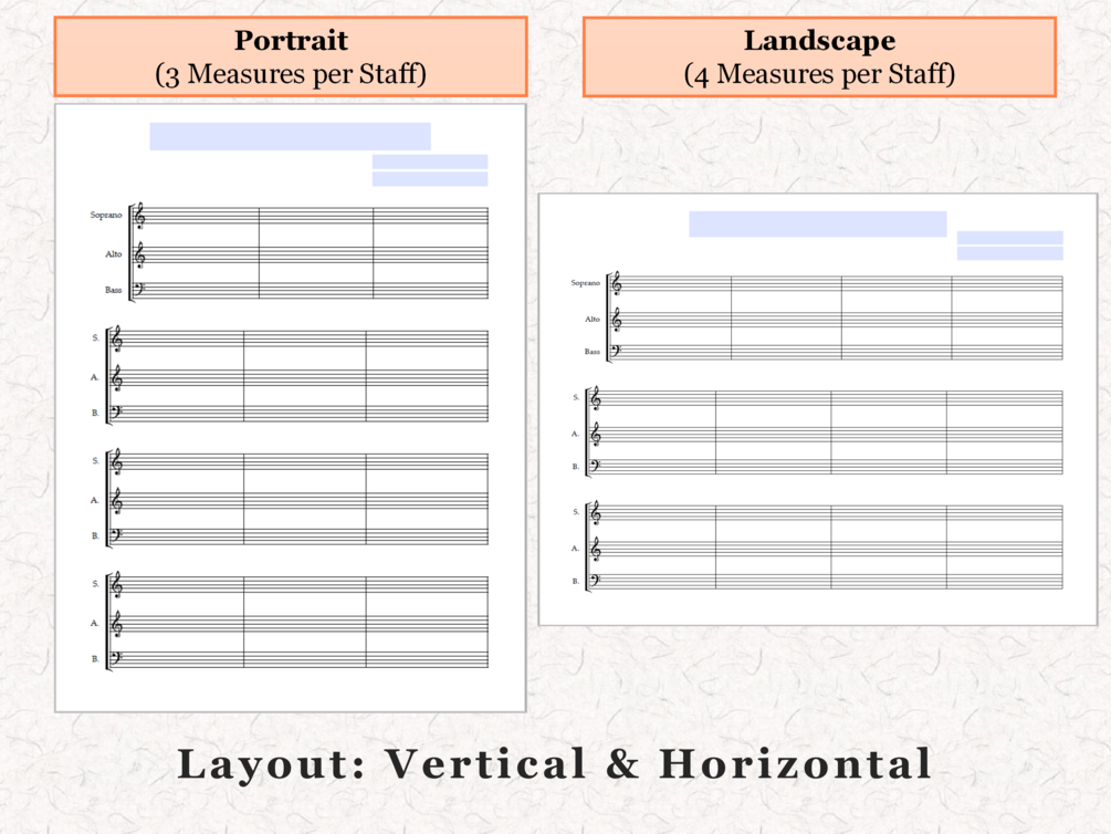 4. US Letter (8.5” x 11”) size PDF Landscape Blank Sheet Music for SAB Choir.