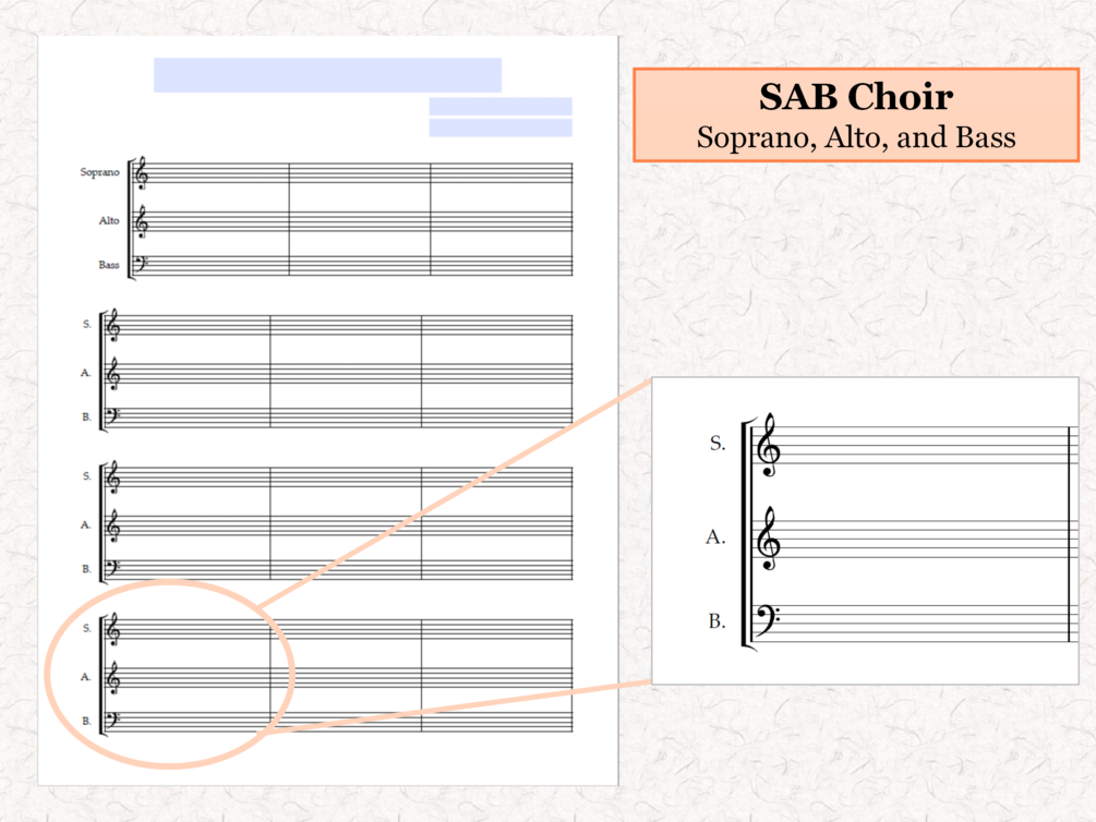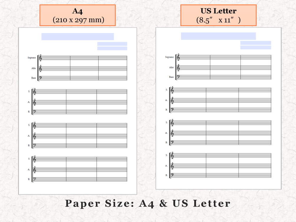 2. US Letter (8.5” x 11”) size PDF Blank Sheet Music for SAB Choir.