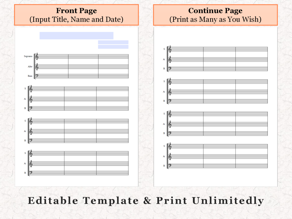 On the top of the first page, you can simply input Title, Name and Date information. The following page is for continuing music, and you may print as many as you wish. A4 (210 x 297 mm) and US Letter (8.5” x 11”) paper sizes are both ready, with Portrait and Landscape layouts.